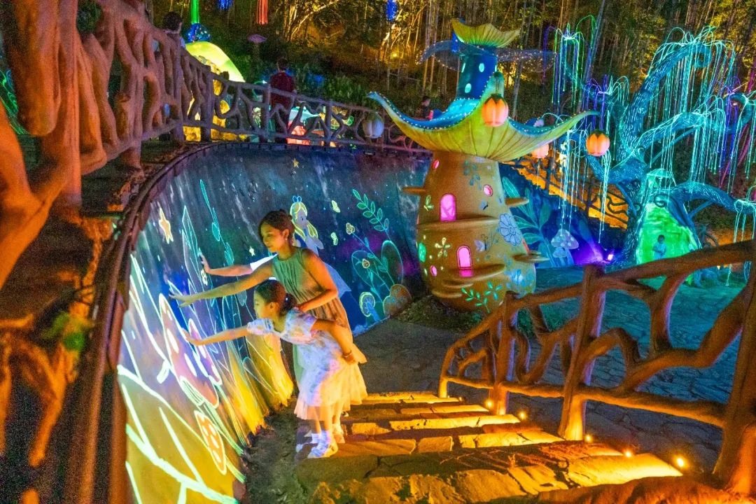 奇妙夜游光影世界:踏入“稻田奇遇記”,漫步金色燈海小徑,打卡蝴蝶秋千、愛心池、月相時(shí)空隧道;探秘“魔幻流光森林”,觸發(fā)20多處光影互動(dòng)裝置,開啟夜間探險(xiǎn)。