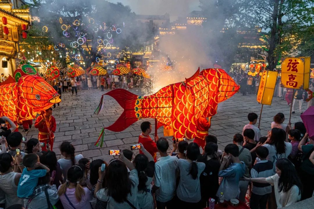 當(dāng)飛檐翹角被霓虹勾勒,弦高西湖凼文旅街區(qū)的夜生活才真正蘇醒。水波倒映著燈火牌坊,璧月門下川劇變臉驚鴻一瞥,魚燈巡游隊(duì)伍穿梭在青石板巷弄,非遺火壺與火刀秀劃破夜空……這里無須門票,是名副其實(shí)的“暢玩天堂”。