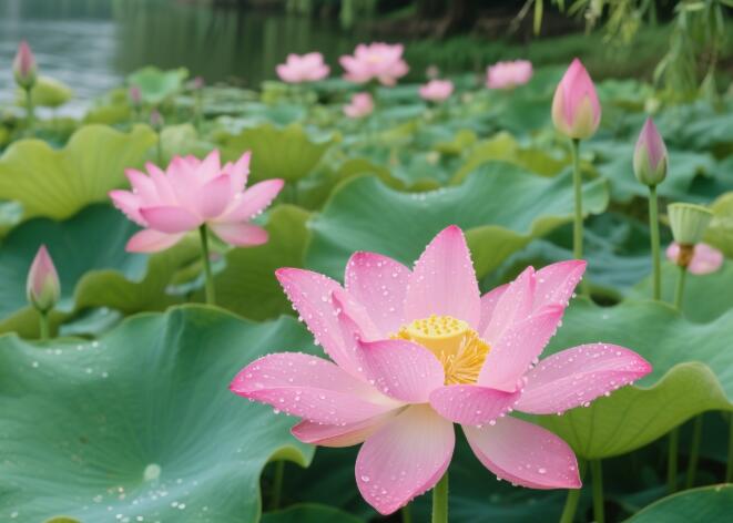 清晨,陽光剛剛露出笑臉,晶瑩的露珠在荷葉上歡快地滾動,折射出七彩光芒;傍晚,夕陽西下,金色的余暉灑在荷塘,為每一片荷葉、每一朵荷花都鑲上了金邊;雨中的荷塘更是別有一番韻味,細(xì)密的雨絲打在荷葉上,發(fā)出滴答滴答的聲響,仿佛在演奏一首夏日的樂章。