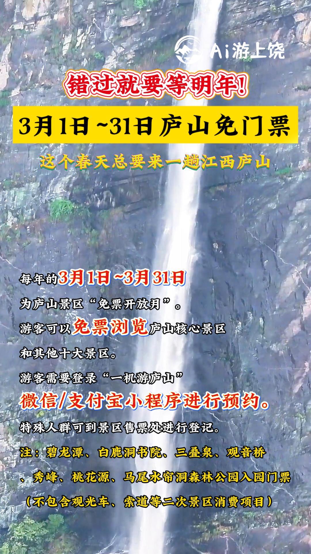 3月1日~3月31日廬山免門票!游客可免票瀏覽廬山核心景區(qū)和其他10大景區(qū)。